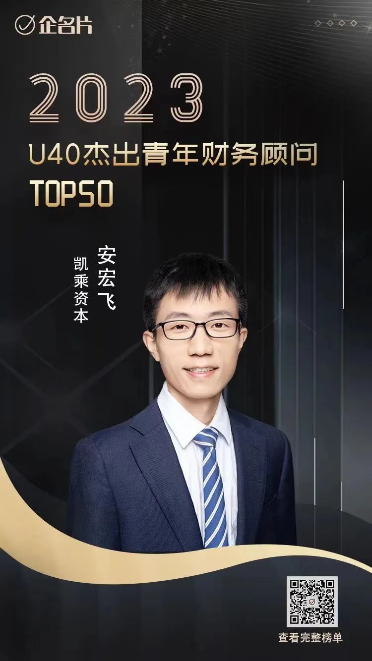 2024年1月26日,企名片《2023年度U40杰出青年财务顾问TOP50》榜单正式发布。凯乘资本合伙人时存义、合伙人安宏飞荣获《2023年度U40杰出青年财务顾问》称号。也是TOP50榜单中仅有的专注创新药、生物技术方向的杰出青年财务顾问,充分体现了凯乘资本在大健康领域,特别是创新药/生物技术等领域的头部地位。